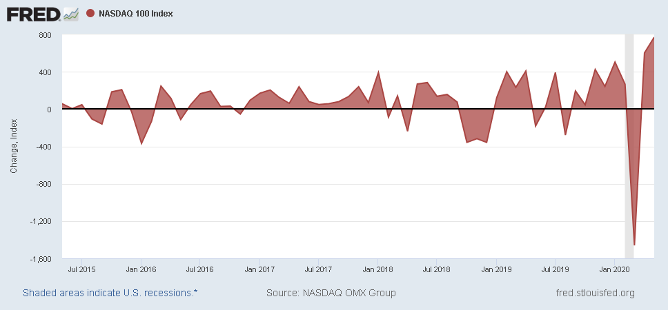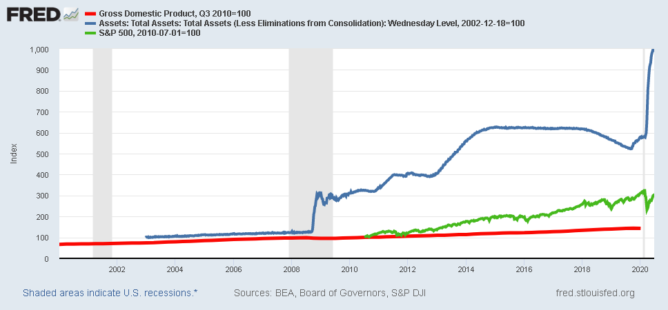 Vedle těchto indikátorů je pak finanční trh, který bez ohledu na reálnou ekonomiku roste zběsilým tempem. Odtržení od reality lze vysledovat po hypotéční krizi v 2008 a bezprecedentním nafouknutí bilance FED nad do té doby akceptovatelnou mez.