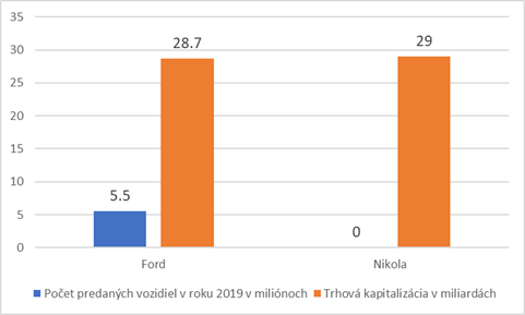 Společnost má v automobilovém sektoru inovativní příslib jako Tesla s cílem vybudovat flotilu elektrických kamionů s vodíkovými palivovými články, ale šílenství zde přesahuje realitu a prodávající akcionáři to už pravděpodobně podle výprodeje akcií pochopili. Problémem je, že Nikola nemá zatím k dispozici žádný produkt k prodeji, ani připravený plně funkční prototyp. I přesto, automobilka dokázala v červnu svou kapitalizací převýšit automobilový gigant Ford. Přiložený graf ukazuje počet prodaných vozů k tržní kapitalizaci společností Nikola a Ford.