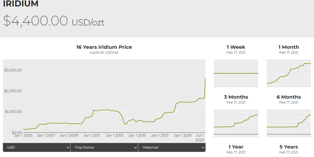Ceny se vyšplhaly na rekordní maximum 4 390 USD za unci v únoru letošního roku z 1 685 USD 12. prosince 2020, čímž se zrychlila rallye, která začala už v roce 2016, kdy iridium stálo kolem 500 USD za unci.