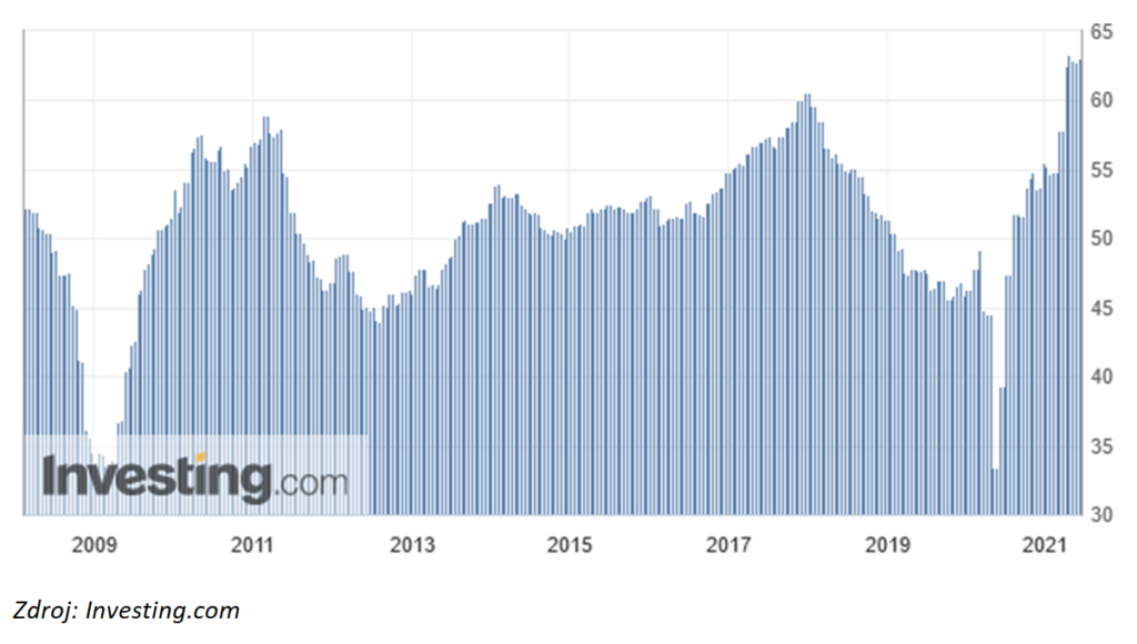 Nejsledovanější výrobní PMI index eurozóny dosáhl nové historické hodnoty už 3. měsíc po sobě. V současnosti se hodnota indexu pohybuje na úrovni 63,1 bodů, což je nejvyšší hodnota za posledních 24 let (od počátku zhotovování indexu). Rozvíjející se výrobní sektor přispívá k indikaci, že ekonomika eurozóny ve druhém čtvrtletí výrazně ožívá. Hlavním důvodem je květnové oživení růstu PMI indexu služeb, který vykazuje známky oživování ekonomiky.
