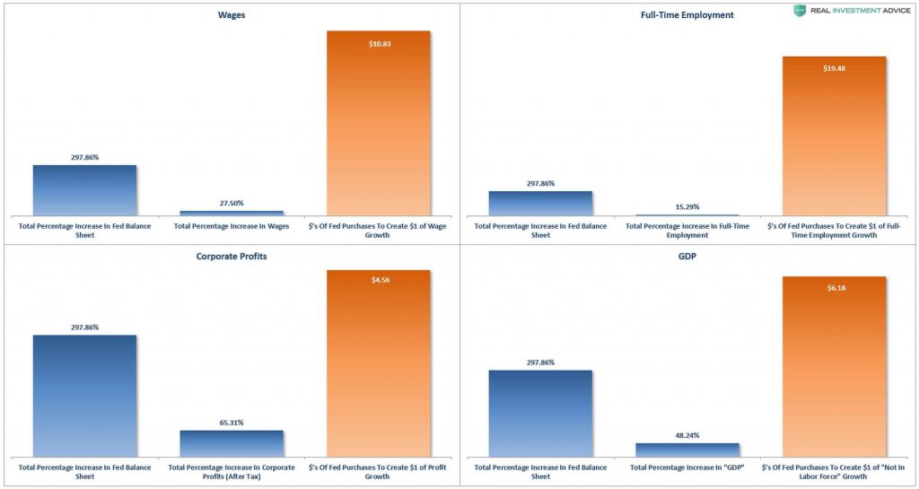 Z analýzy Lanca Roberta z RIA (realinvestmentadvice) vyplývá, že naneštěstí lze říci, že masivní expanze rozvahy se odráží na vysokých cenách akcií nebo nemovitostí, ale efekt stimulace do odvětví ekonomiky jako např. mzdy, zaměstnanosti, zisky firem po zdanění a celkovém procentuálním nárůstu HDP se nedostává do takové míry, do jaké se očekávalo.