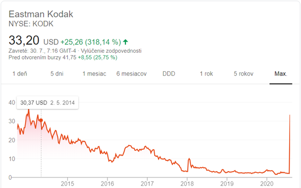 Značku Eastman Kodak zná zřejmě každý. Firma s 132letou historií se proslavila jako tehdejší lídr na trhu s fotografickými potřebami. Jenže kamenem úrazu se pro ni stal přechod na digitální fotoaparáty, který neustála, a v roce 2012 vyhlásila úpadek. Následovala série prodejů celé řady patentů, které vlastnila. Nyní se ale zdá, že nejhorší už má za sebou a začíná novou podnikatelskou éru. Svou budoucnost vidí ve výrobě generik a akcie společnosti na oznámení reagovaly doslova raketovým růstem o 570 procent.