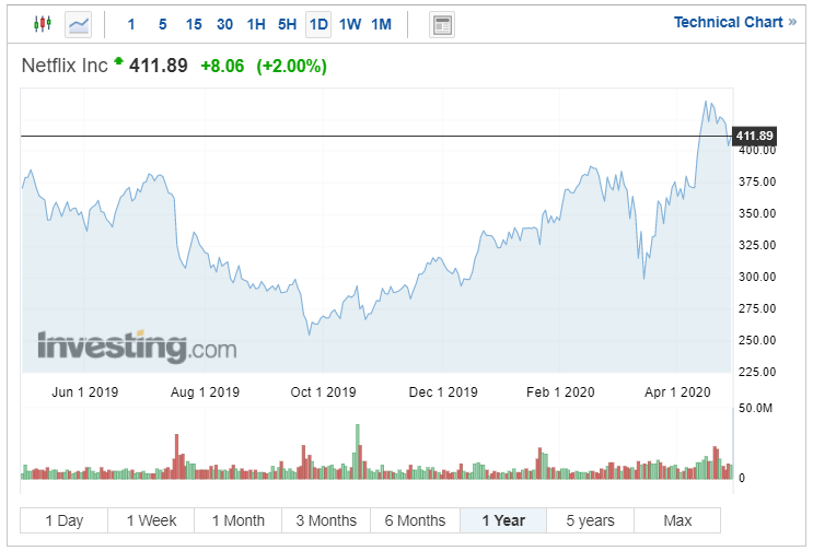 Přestože akcie streamovací společnosti Netflix v polovině března ztrácely stejně jako většina instrumentů obchodovaných na kapitálových trzích v důsledku obav ze začátku koronavirové krize, nakonec akcie společnosti ze zavedených restrikcí jednotlivých států z dlouhodobějšího hlediska dokázali vytěžit. Za poslední měsíc a půl si totiž připsali k hodnotě 38 procent.
