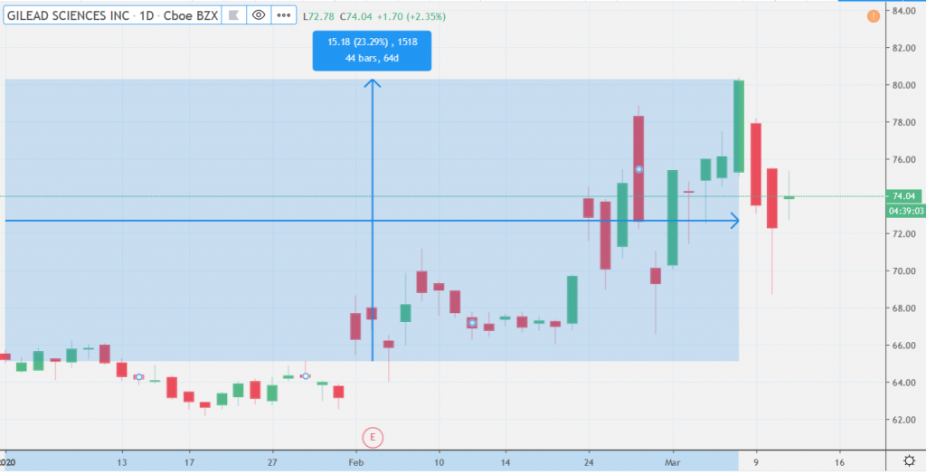 Hodnota společnosti od začátku roku vzrostla o více než 23 %, jak můžete vidět na grafu. Hlavním důvodem je zmíněný lék na koronavirus. Na druhé straně, společnost stejně jako ostatní se v posledních dvou dnech nevyhnula propadu z důvodu přelévání investic investorů do méně rizikových aktiv.