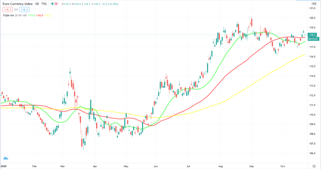 V současnosti druhá vlna koronaviru a nová omezení přispívají k obnovení ekonomického pesimismu v Evropě. Evropské akcie tento měsíc reagovaly poklesem na nová minima. Pravděpodobné je projevení se v rétorice budoucích zasedání ECB. Průzkum společnosti McKinsey zjistil, že více než polovina malých a středních společností v Evropě se domnívá, že jim v následujících letech hrozí zánik. Nová omezení znamenají, že bude pravděpodobně potřebné navýšení záchranného balíčku. Podle ohlasů ECB schválí navýšení o 500 miliard eur během prosincového zasedání. Přestože tento krok bude znamenat nárůst nabídky a logicky oslabení eura, z dlouhodobého hlediska by měna měla posilovat oproti „risk-on“ ale hlavně komoditním měnám jako kanadský dolar anebo australský dolar.