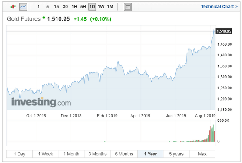 Celkově hodnota zlata na akciových trzích výrazně stoupá už několik týdnů a během pátečního obchodního dne dosahovala 1510 USD za unci. Na takových úrovních se kov naposledy obchodoval v březnu 2013. Od začátku srpna 2019 vzrostla jeho hodnota o 7 procent.