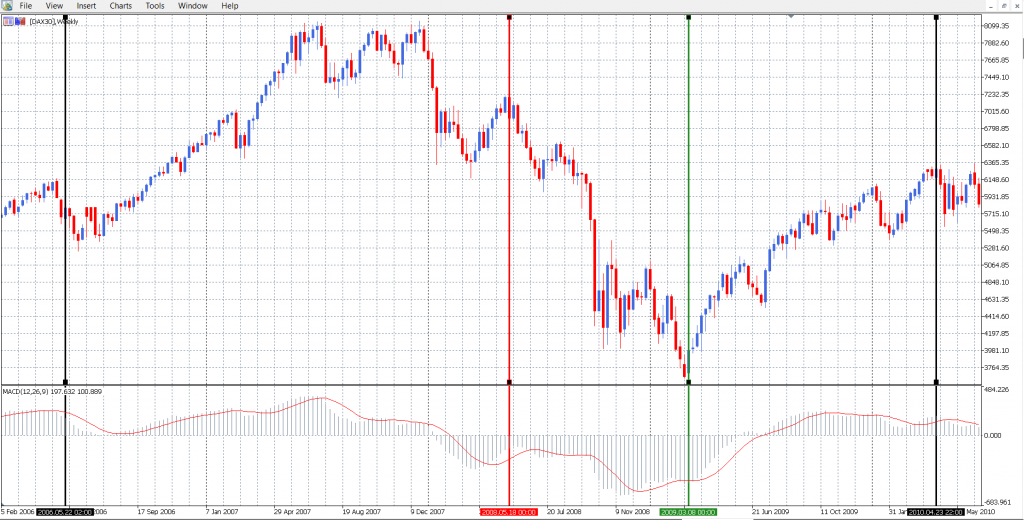 Nyní porovnáme vývoj IFO indexu s vývojem německého akciového indexu DAX. Časové období je v prvním grafu ohraničené svislými čarami a také je na první pohled viditelné, že na začátku sice rostl, v létě roku 2007 vytvořil nová historická maxima, ale ta už nedokázal překonat.