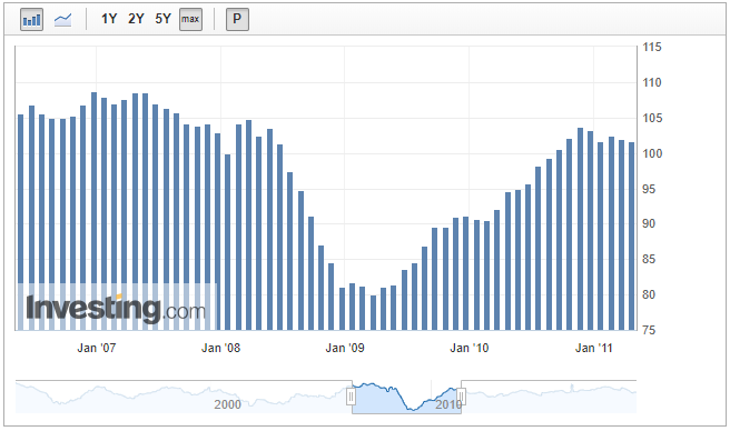 Od roku 1972 zveřejňuje mnichovský institut IFO každý měsíc index podnikatelského klimatu IFO a časem se ukázalo, že je tento index relativně spolehlivý. Ukážeme si to na recesi z roku 2008. Na grafu můžete vidět, že se index od začátku roku do poloviny roku 2008 s menšími odchylkami hýbal okolo hladiny 105 bodů. V květnu začal IFO index výrazně klesat a zastavil se až v březnu 2009 na hladině 80 bodů. Poté začal růst.