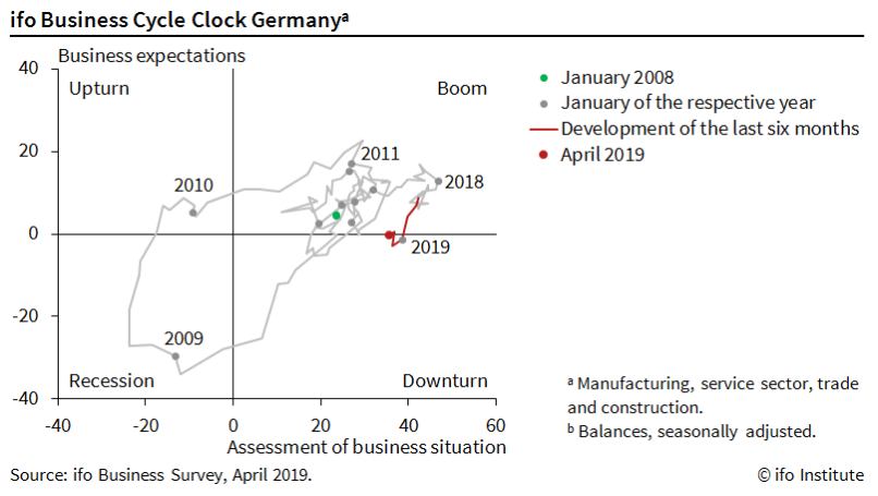 Institut IFO zveřejňuje například každý měsíc také grafické znázornění ekonomického cyklu. Podle těchto údajů je pravděpodobné, že období nejsilnějšího ekonomického růstu má už v rámci tohoto cyklu Německo za sebou a je jen otázkou času, kdy se dostane do recese. Podívejte se na to, jak hodně se změnil graf od zelené tečky – leden 2008 až leden 2009. Tečka skočila přímo z kvadrantu znázorňujícího ekonomický rozkvět do kvadrantu symbolizujícího recesi.