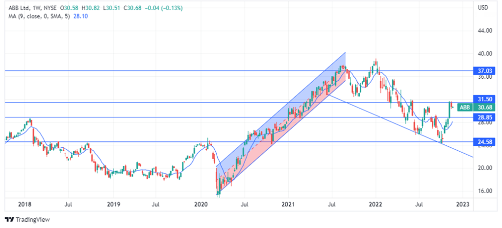 Jak ukazuje graf TradingView, společnost ABB kótovaná na newyorské burze zaznamenala od začátku roku 15% pokles * Při ceně kolem 30 USD se akcie obchodují nad úrovněmi podpory poblíž 25 a 29 USD a pod značkami odporu o 31 a 37 USD. Dlouhodobý výhled vypadá pro akcie ABB optimisticky. [1]