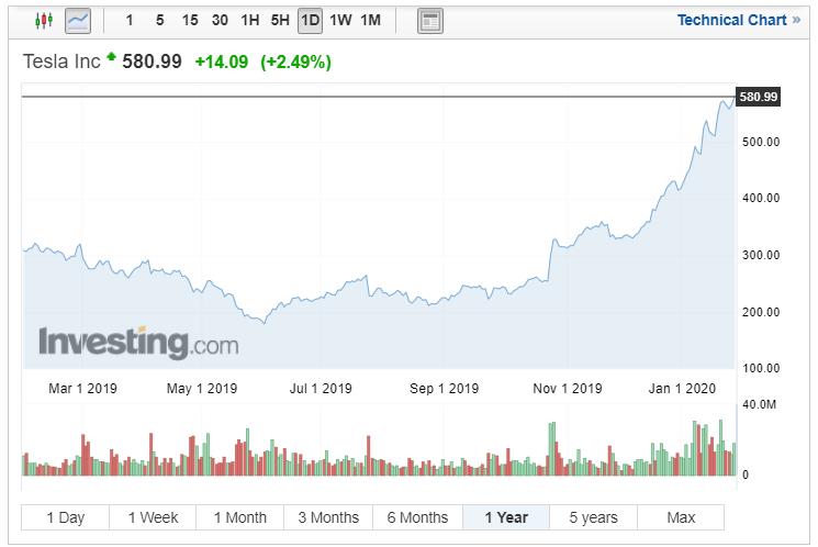 Hodnota akcií Tesly na kapitálovém trhu vzrostla po středečním oznámení, že společnost vykázala druhý kvartální zisk za sebou. Cena následně posilnila o 13 procent a poprvé překonala hranici 600 USD za akcii. Cena akcií společnosti se tak oproti minulému roku více než ztrojnásobila.