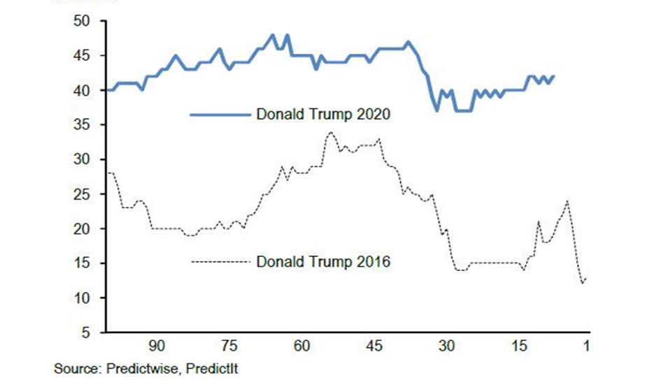 V roce 2016 byl Donald Trump outsiderem a výhra Hillary Clintonové byla víceméně jistá. Trhy a většina prognóz předčasně počítaly s její výhrou, ale výsledek ukázal opak. V současnosti můžeme pozorovat, že v roce 2019 celý svět nepochyboval o znovuzvolení Donalda Trumpa, ale dnes se na základě preferencí všechno změnilo. V současnosti má jen Trump 13% šanci porazit Bidena. Částečně to můžeme připsat koronaviru, který způsobil největší ekonomický propad HDP a nezaměstnanosti od 2. světové války. Můžeme očekávat scénář z roku 2016, kdy outsider Donald Trump překvapí a bude znovuzvolen?