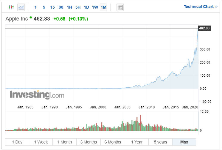 Graf: Vývoj hodnoty akcií Apple od prosince 1980 po současnost na burze Nasdaq (Zdroj: Investing.com)