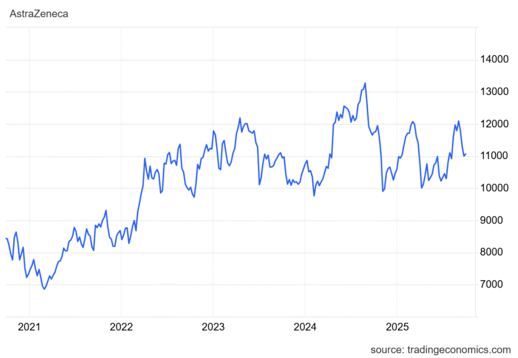 Výkonnost akcií AstraZeneca za posledních pět let. * Zdroj: Trading Economics