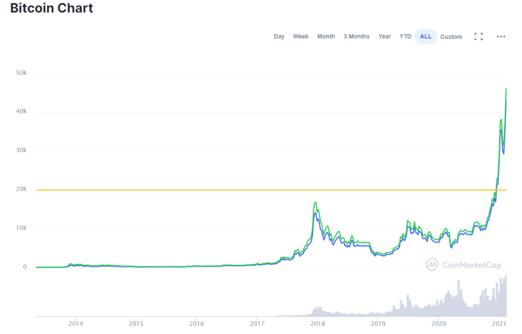 Během čtvrtečního obchodování se cena pohybovala podle coinmarketcap.com o něco níže, nad hranicí 46 tisíc USD. Podle šéfa kryptoměnové burzy v Singapuru, Luno Vijay Ayyar, má Bitcoin obrovský potenciál, protože je pravděpodobné, že po vzoru PayPal a Tesly ho budou využívat i další firmy. Můžeme tedy očekávat, že jeho nákup nebo využití v podobě platidla postupně oznámí i jiní velcí hráči na trhu, což by podpořilo další býčí rallye a dosahování nových maxim.