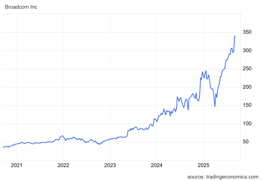 Výkonnost akcií společnosti Broadcom za posledních 5 let. * Zdroj: Trading Economics