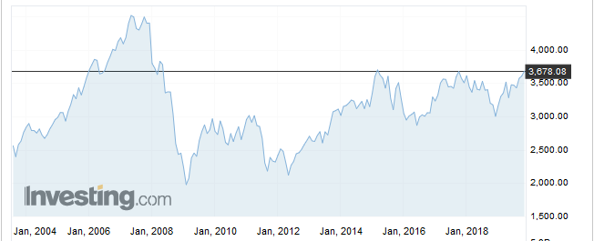 NA grafu můžeme pozorovat, že indes Eurostoxx 50 se nedostal na hodnoty v průběhu hypotékové krize v 2088, což mu dává dostatečný prostor na růst.