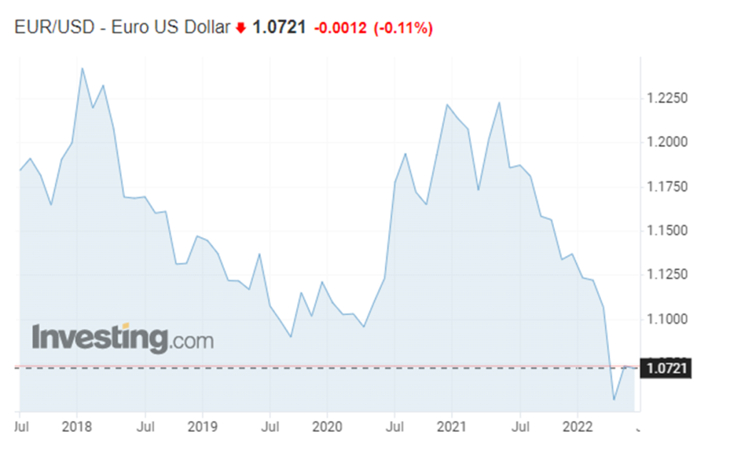 Dnes se nacházíme v jiné situaci. Mnozí si kladou otázku, jakým směrem se bude hodnota měny ubírat, protože celý region se nachází v obtížné situaci. S vojenským konfliktem přišla hrozba energetických dodávek a rostoucí inflace. Střední třída v Evropě začíná mizet a lidé s nejnižšími příjmy se ocitají na pokraji chudoby. Tato situace samozřejmě ovlivňuje i hodnotu eura, v Evropě hrozí stagflace a odborníci se dohadují o vývoji měny. Podle nového průzkumu MLIV Pulse může hodnota eura skončit na úrovni dolaru. Až 60 % respondentů uvedlo, že si myslí, že euro vstoupí do fáze parity, přičemž malá většina z více než 400 účastníků průzkumu předpovídá, že se poté vrátí na úroveň 1,15 USD. V těchto dnech se euro vůči dolaru obchoduje na úrovni přibližně 1,07[1].