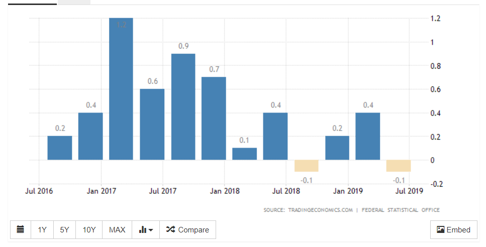 Jak se ukazuje, nejlepší časy už má za sebou i největší ekonomika Evropy (Německo). HDP země ve druhém čtvrtletí klesl v důsledku útlumu zahraničního obchodu o 0,1 procenta, kdy se export ze země snížil výrazněji než import. Pravděpodobnost technické recese v zemi se neustále zvyšuje, což potvrzují i údaje oslabení výroby ve třetím čtvrtletí. Všeobecně přitom je možné technickou recesi definovat jako pokles HDP během dvou čtvrtletí za sebou.