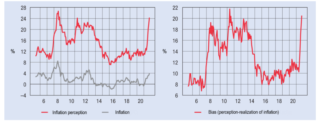 Obrázek 1: Vnímaná a reálná inflace (vlevo) a zkreslené vnímání inflace (vpravo). (Zdroj: hnb.hr)