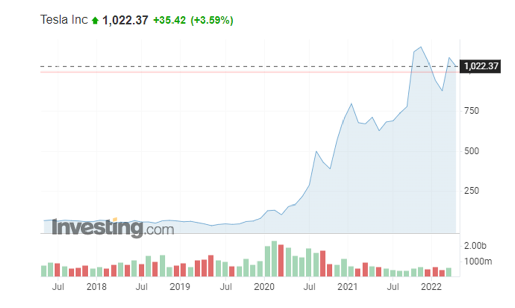 Výkonnost společnosti Tesla Inc za posledních 5 let. (Zdroj: www.investing.com)