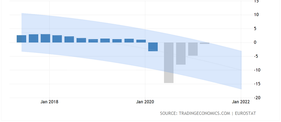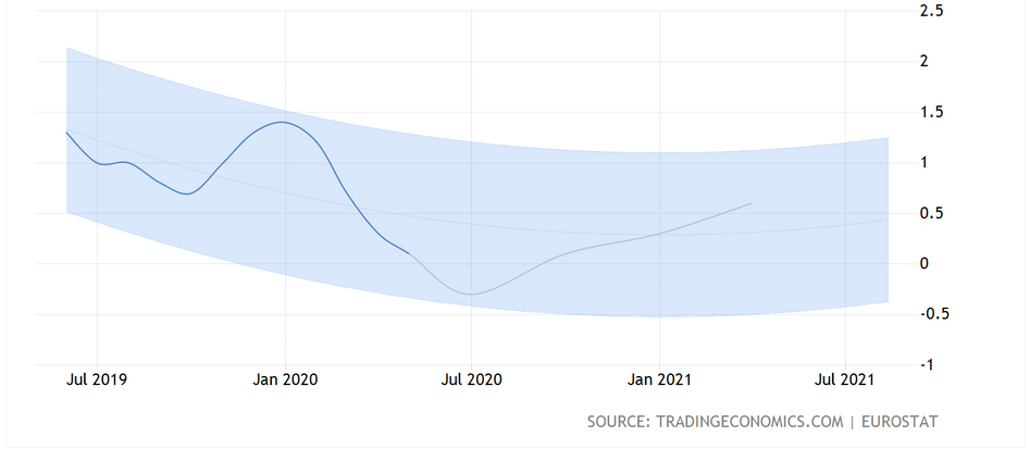Pro mnohé ekonomy je však důvod pro okamžité pobídky ECB přesvědčivý, neboť hospodářství eurozóny se v prvním čtvrtletí snížilo rekordním tempem a ve druhém se očekává až 14,7% pokles. Jak můžeme vidět na grafu, pokles HDP by měl pokračovat i v dalších čtyřech kvartálech. Oživení se očekává až v roce 2021 a 2022 na 4 % a 2,3 % úrovni růstu.