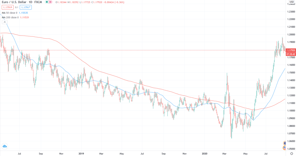 Euro v posledních třech měsících zažívá apreciaci vůči většině světových měn, hlavně americkému dolaru. U většiny lidí to může evokovat domněnku, že by se měna jedné z největších ekonomik světa v nejistých časech mohla stát majákem stability. Ale pravda je někde jinde. Posilnění eura je jen výsledkem depreciace amerického dolaru. Dolar je v současnosti oslaben hned několika faktory: rostoucí nejistotou vyvolanou nadcházejícími prezidentskými volbami v USA a taktéž akumulací ztrát z půjček z koronavirové krize. Globální investoři jednoduše snižují expozici svých dlouhých pozicí v dolarech a býci alokováni v eurech jednoduše vyplňují dočasnou mezeru.