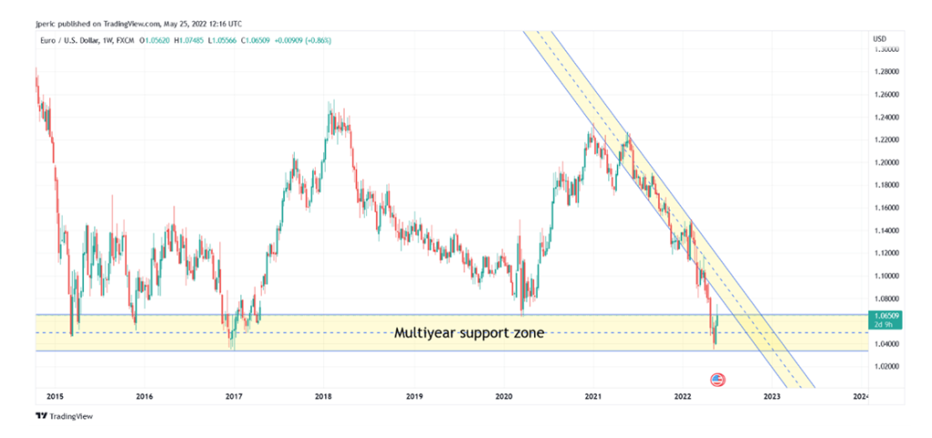 Týdenní vývoj kurzu EUR/USD od roku 2015 (zdroj: Tradingview)