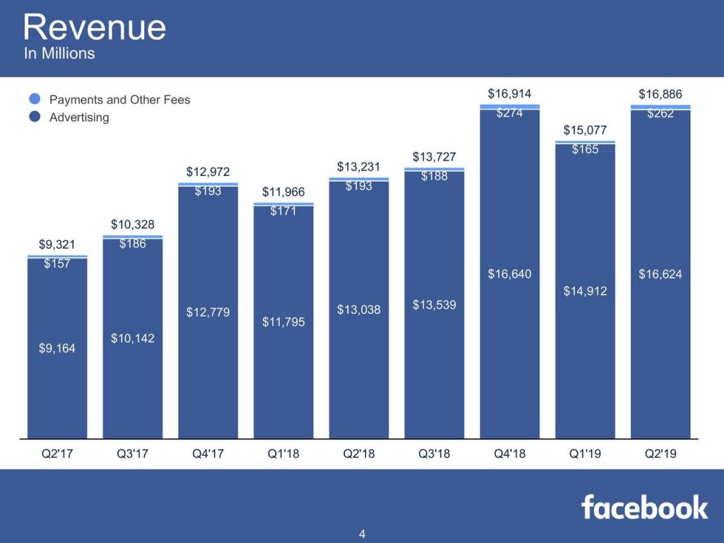 Počet aktivních uživatelů Facebooku na denní bázi ve druhém čtvrtletí 2019 vzrostl na 1,59 miliardy, což je meziroční nárůst o 8 %. Počet aktivních uživatelů na m/m bázi byl kolem 2,41 miliardy, což představuje meziroční nárůst o 8 %. Tržby FB z mobilní reklamy vzrostly na 94 % celkových příjmů z reklamy ve srovnání s 91 % ve stejném období minulého roku.
