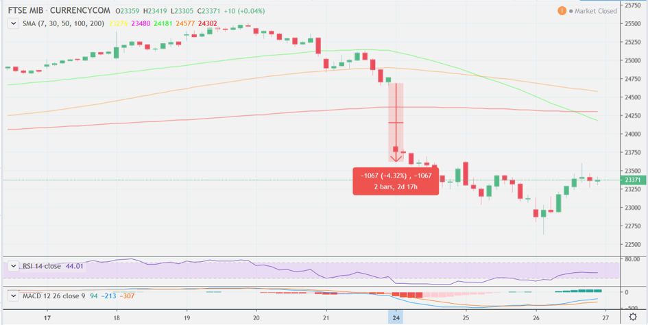 Za sérií propadů na začátku týdne bylo pondělní zveřejnění 229 potvrzených nakažených a 6 úmrtí v Itálii a následná panika ohledně rozšíření do celé Evropy. Italské podniky a vláda promptně reagovala zavřením škol, muzeí a podniky jako například Unicredit doporučovali svým zaměstnancům home office. Obava posílená tímto vývojem otevírá obavu na světě z potenciální recese 3. největší ekonomiky eurozóny, po 0,3% poklesu HDP ve třetím čtvrtletí 2019.