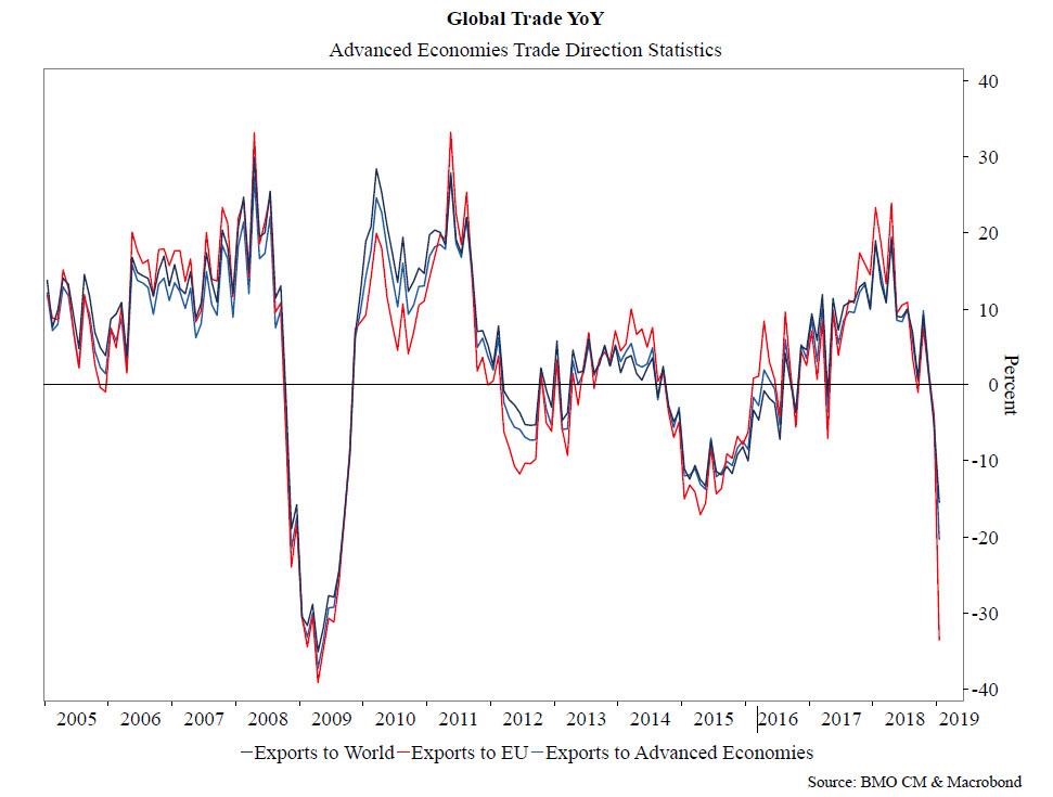 Nejlepší způsob jak si představit, jak vážná je hrozba a důsledky obchodní války pro globální obchod a světové hospodářství, je prohlédnout si graf meziročních změn v celosvětovém obchodě. Tento graf ukazuje negativní trend světového exportu – a to v něm ještě nejsou zatím zahrnuty nové tarify.