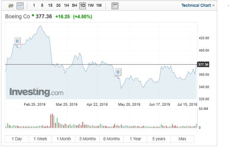Před začátkem obchodování v reakci na zveřejněnou informaci akcie firmy v pátek ztrácely 2,3 procenta. Obchodní den však nakonec uzavřely v zelených číslech na hodnotě kolem 377 USD za akcii. Důvodem posílení byla zřejmě informace o tom, že firma počítá s dřívějším termínem, než byl původně odhadovaný návrat letadel 737 Max do provozu, což uklidnilo investory. Podle předpokladu Boeingu odstartuje schvalování návratu strojů regulátorem již začátkem čtvrtého čtvrtletí.