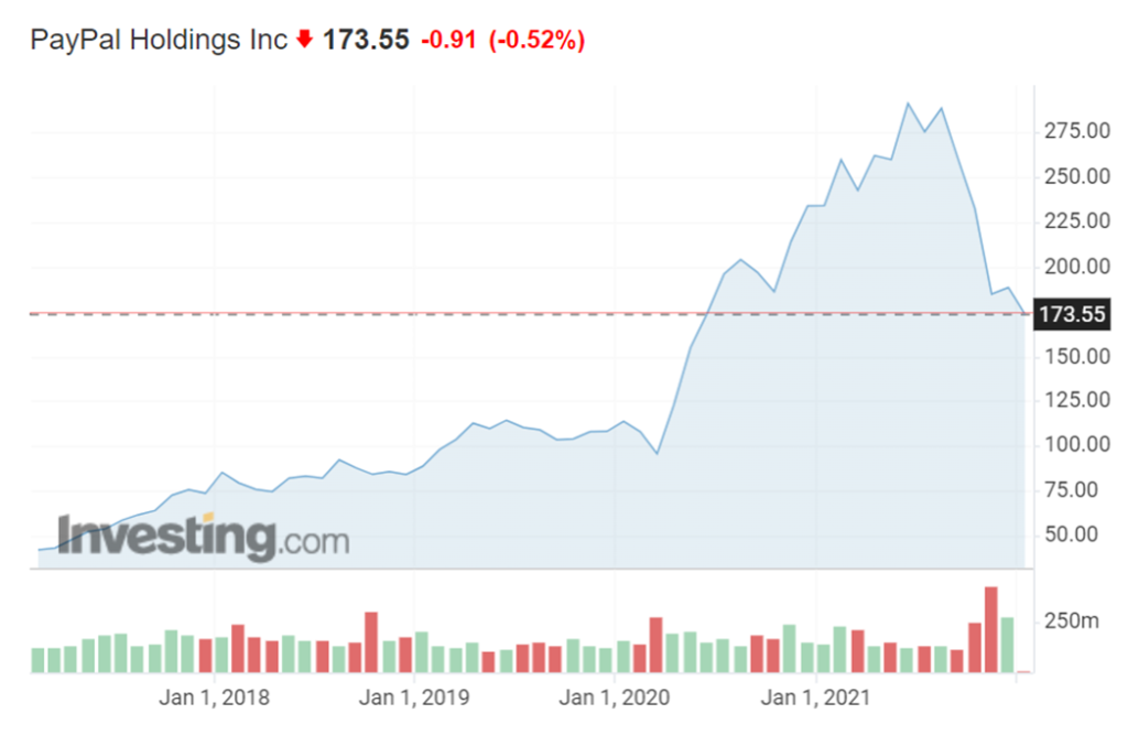 Cena akcií se v posledních měsících propadla přibližně o 40 % a společnost se náhle ocitla v nemilosti investorů. Podle jedné z teorií za to může Fed, který začíná zvyšovat úrokové sazby. To je důsledek stále rostoucí inflace. Dalším momentem, kdy akcie společnosti PayPal začaly klesat, bylo oznámení o snížení ratingu od analytiků společnosti Bernstein. Pokud se podíváme na technologické akcie jako celek, vidíme v současném období výprodeje a byl zde i okamžik, kdy se akcie dostaly do oblasti korekce.*