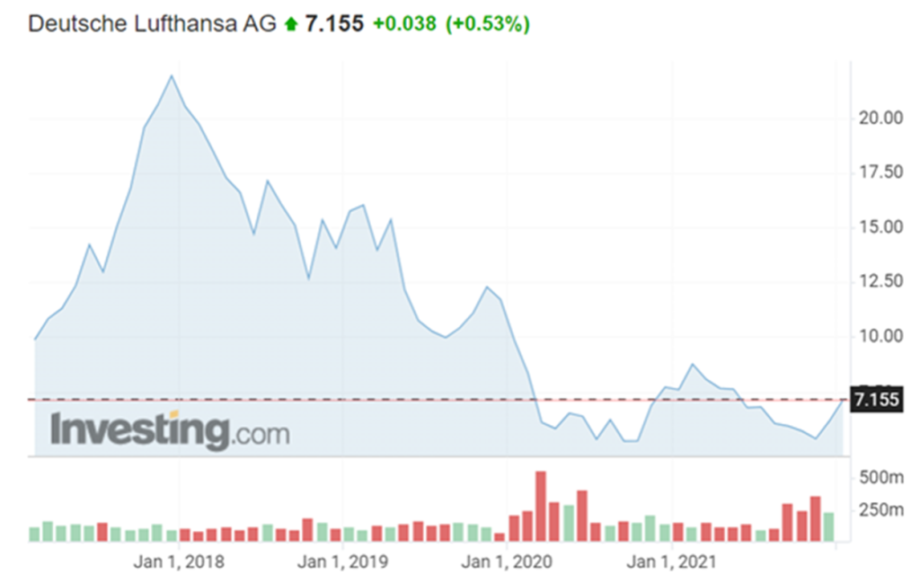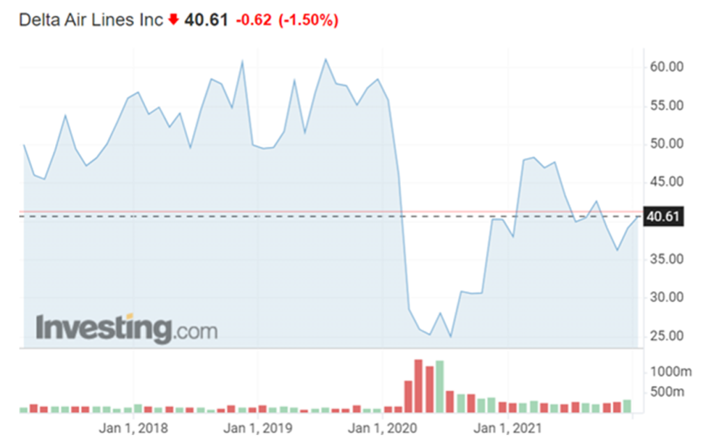 Výkonnost společnosti Delta Air Lines Inc za posledních 5 let. (Zdroj: www.investing.com)