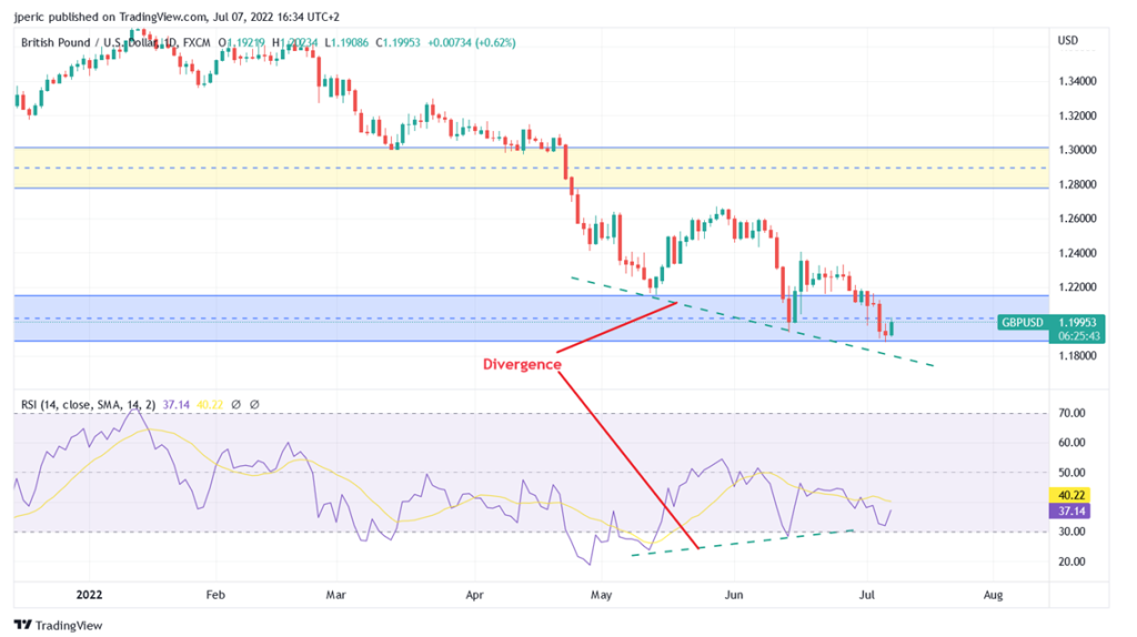 Jak můžeme vidět na grafu 1, GBPUSD je na víceletém supportu, který si drží svou pozici. Při pohledu na graf 2 vidíme divergenci, která by mohla znamenat možný obrat ceny.