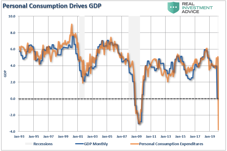 Spotřebitelské výdaje a HDP jsou úzce korelovány, jak je možné vidět i na grafu zachycující vývoj těchto dvou proměnných od ledna 1993 do současnosti. Není divu, že pokud spotřebitelské výdaje z důvodu současné více než 20 % míry nezaměstnanosti poklesnou, čímž ekonomický růst klesá.