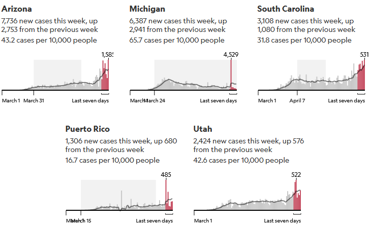 Pozorováním finančních trhů, masivních odprodejů rizikových aktiv a výkonnosti amerických deseti a třicetiletých státních dluhopisů dojdeme k závěru, že nastupuje druhá vlna koronavirové krize. V několika amerických státech byl rovněž zaznamenán zvýšený výskyt případů Covid-19, jak můžeme vidět na grafu s největšími ohnisky pandemie za poslední týden. Pokles akcií držených domácnostmi hovoří o realitě, že pandemie je v současnosti nejmocnější hybnou silou globálního výhledu v každé zemi.