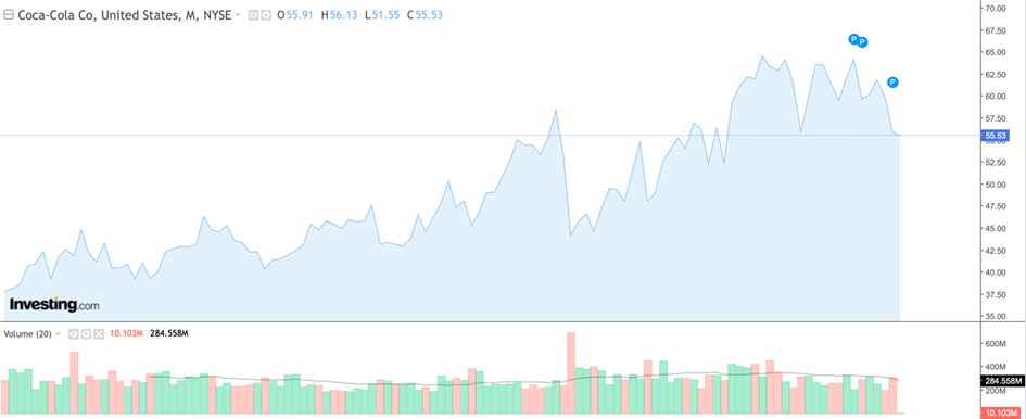 Graf: Vývoj hodnoty společnosti Coca- Cola za posledních 10 let. (Zdroj: Investing.com)