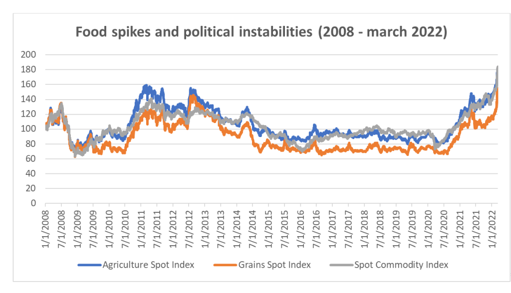 Korelace mezi prudkými nárůsty cen potravin a politickou nestabilitou lze ukázat v grafu 1.