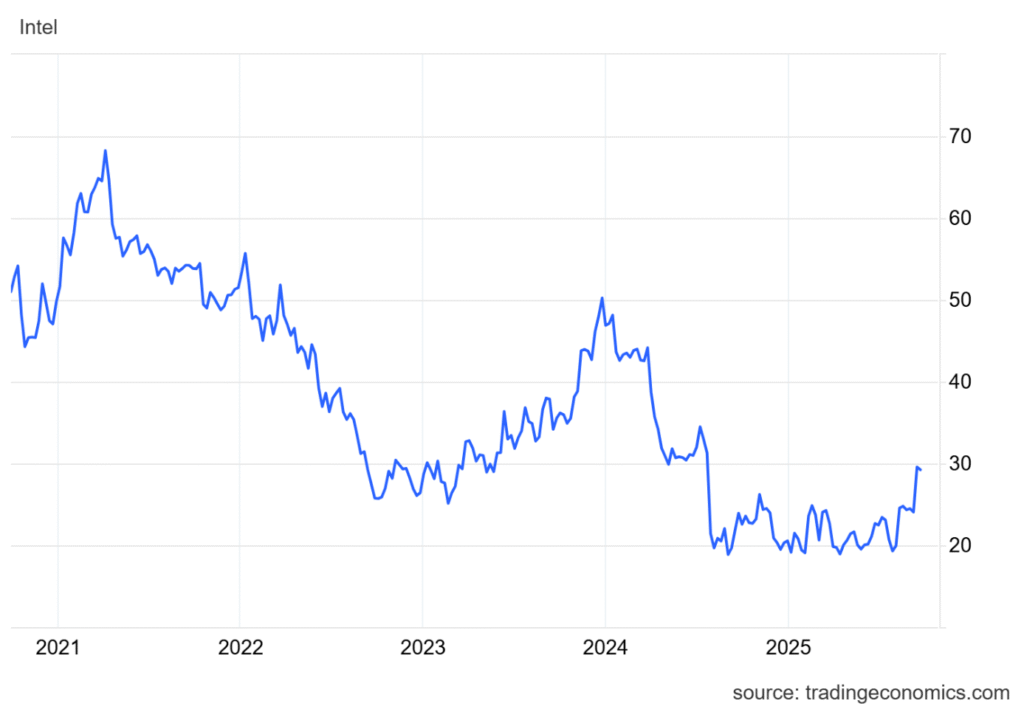 Produktové propojení zmíněných gigantů přichází zároveň i s investicí Nvidie v objemu 5 miliard USD do kmenových akcií Intelu. Nezbytné je však zhodnotit i dlouhodobější situaci Intelu. Za posledních pět let firma bojuje se ztrátou tržní hodnoty – od lokálního vrcholu z roku 2020 došlo k poklesu ceny akcií o více než 50 %.*