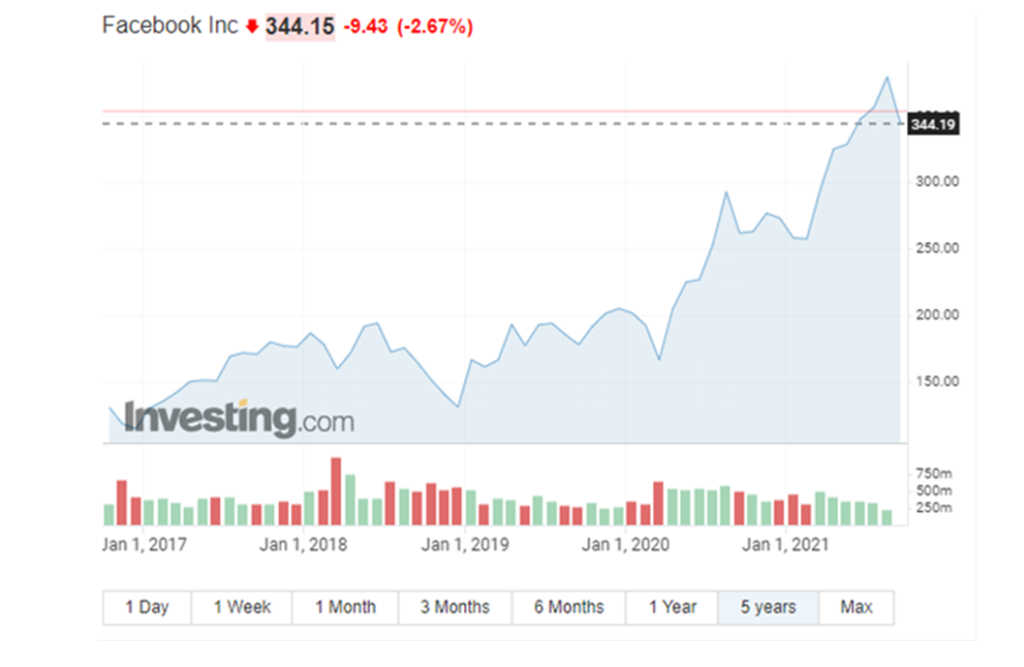 Výkon společnosti Facebook Inc za 5 let. (Zdroj: www.investing.com)