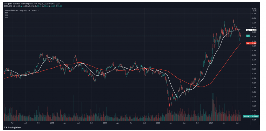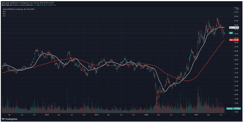 Denní vývoj ceny akcií GM za posledních 5 let (Zdroj: www.tradingview.com)