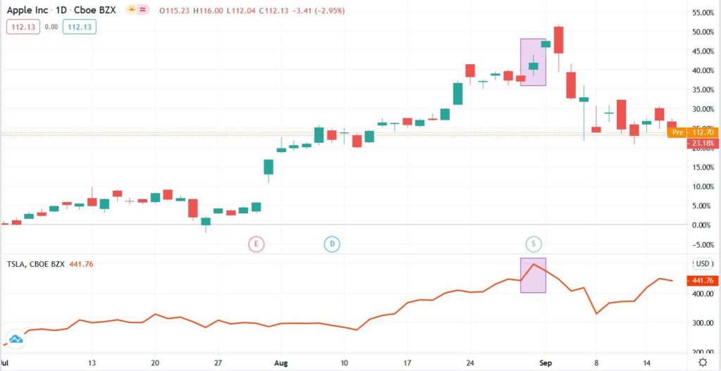 V přiloženém grafu můžeme sledovat fialovým obdélníkem označený první zářijový obchodní den, který znamenal obchodování akcií Apple (svíčkový graf) a Tesla (oranžová čára) za cenu po rozdělení akcií. Krátkodobé růsty cen však neochránil akcie od medvědího trendu na trhu. v následujících týdnech.