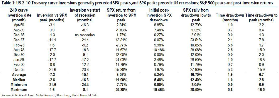 Průměrně do 7 měsíců od inverze trhy zaznamenaly nový vrchol. Můžeme říci, že většinu času trh vytvoří nový vrchol od 2 až 3 měsíců od inverze, ale může to být i téměř dva roky po inverzi. Rozmezí je poměrně vysoké. Z procentuálního hlediska návratnost indexu od inverze dokázala zaznamenat dobrá čísla. To znamená, že inverzní křivka nás může upozornit, že se něco děje, ale přesto se bublina může dále nafukovat i o několik desítek procent. Inverze byla na trhu jen pár dní, od cca 22. srpna do 3. září, a proto se někdo může oprávněně ptát, zda lze označit i tak krátké období jako „inverzi“ nebo ne. Od tohoto data však S & P 500 rostl přibližně 7 – 9 % což je pár procent od mediánu 11.5 %, ale blíže k průměru 9.5 %. Během poslední „anomálie“ na trhu v prosinci 2005 trh dokázal udělat ještě přes 25 procent po svého vrcholu.