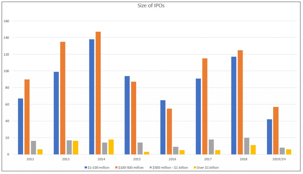 Ve druhém čtvrtletí bylo IPO 75, což je téměř dvojnásobek, než v první čtvrtletí, stále ale o 8,5 procenta méně než ve druhém čtvrtletí roku 2018. V čele s IPO Uberu bylo druhé čtvrtletí z hlediska získaných peněz nejlepším čtvrtletím za posledních pět let. Hrubý výnos činil téměř 30 miliard USD, což je nejlepší čtvrtletní výkon od 3. čtvrtletí 2014, kdy Alibaba debutovala na NYSE.