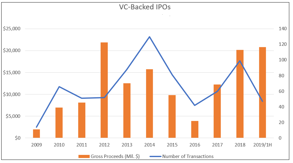 Ve druhém čtvrtletí bylo 35 IPO krytých rizikovým kapitálem (takzvaný venture-capital) – to je nejlepší čtvrtletní výsledek od druhého čtvrtletí roku 2018, kdy jsme viděli 39 nabídek podporovaných rizikovým kapitálem. Seznam zahrnoval tři z mega-IPO skupiny, Uber, Pinterest a Chewy. Hrubý výnos za všech 35 nabídek podporovaných rizikovým kapitálem činil 17,2 miliardy USD, což je největší čtvrtletní výnos od druhého čtvrtletí 2012, kdy debutoval Facebook.