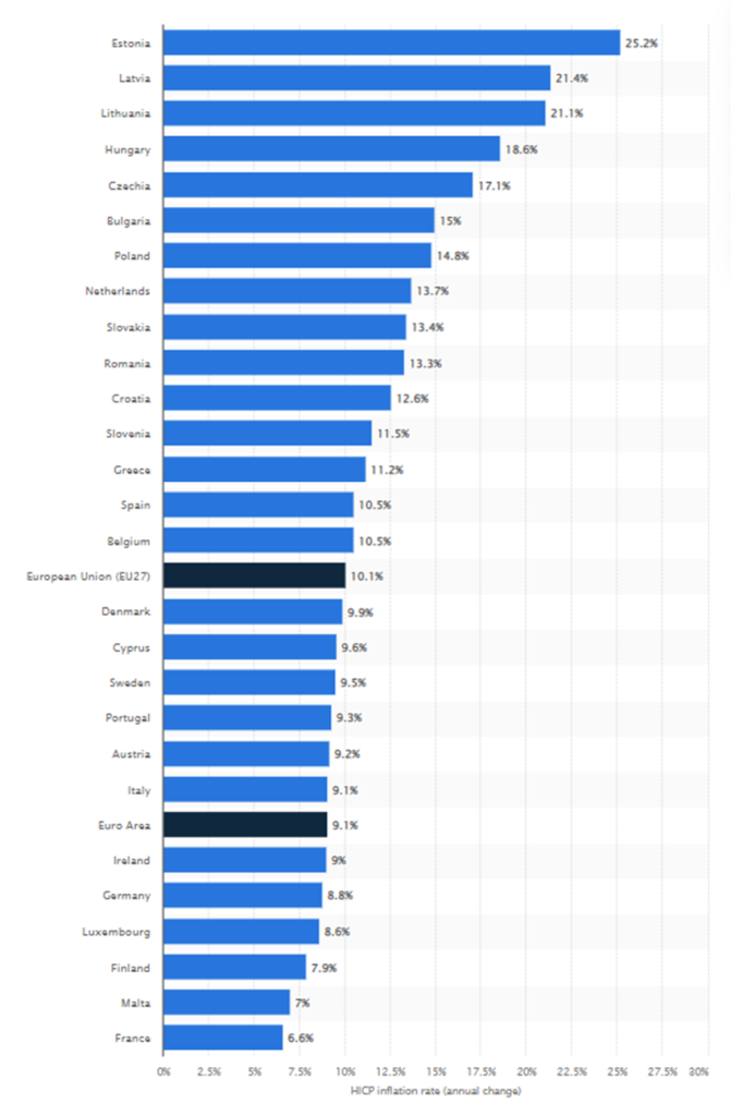 Harmonizovaný index spotřebitelských cen (HICP) v Evropské unii v srpnu 2022 podle zemí. Zdroj: Statista.com