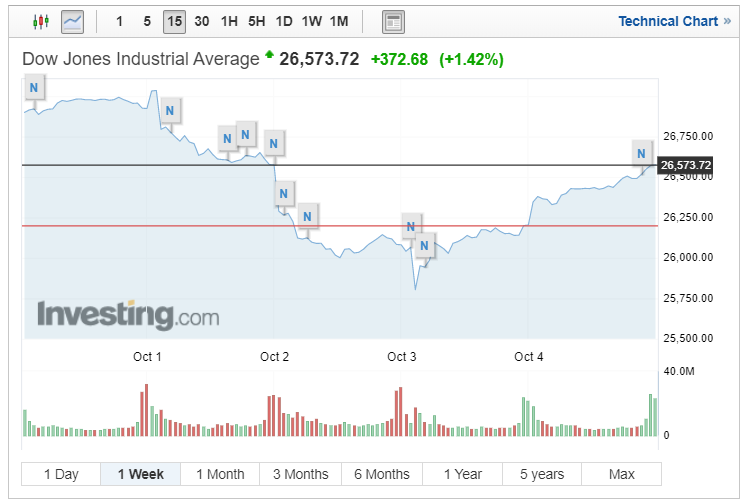 Z týdenního pohledu však uzavřely v červených číslech. Dow Jones si odepsal 0,92 procent a páteční obchodování uzavřel okolo hodnoty 26 572 bodu, S&P 500 ztratil 0,33 procenta okolo úrovně 2 952 bodů. Naopak, index technologického sektoru Nasdaq Composite skončil v plusových číslech a připsal si 0,53 procenta okolo hodnoty 7 982 bodů. Index volatility VIX se propadl o 10, 88 procenta na 17 bodů a výnos desetiletých vládních dluhopisů USA klesl o jeden bazický bod na 1,53 procenta.