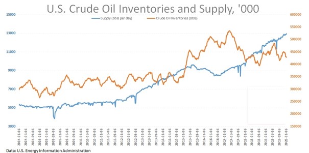 Současné úrovně cen ropy jsou do velké míry darem od OPEC +, který zachovává přísné výrobní kvóty navzdory celkovému zvýšení spotřeby ropy. Zatímco tradiční producenti ropy jako například Rusko a Saudská Arábie uvalují omezení na udržení cen, Spojené státy se staly největším producentem ropy a zvětšují mezeru. Současný objem těžby v USA je na úrovni 13 milionů barelů denně. USA vykazují stabilní nárůst výroby surové ropy od roku 2016. Zásoby budou pravděpodobně i nadále růst, přičemž se očekává, že hrubá ropná produkce USA ve velkých ložiscích břidlic se v únoru zvýší na rekordní úroveň, ačkoli tempo růstu bude pravděpodobně asi za nejníže asi za rok podle Úřadu pro správu energetických informací USA.