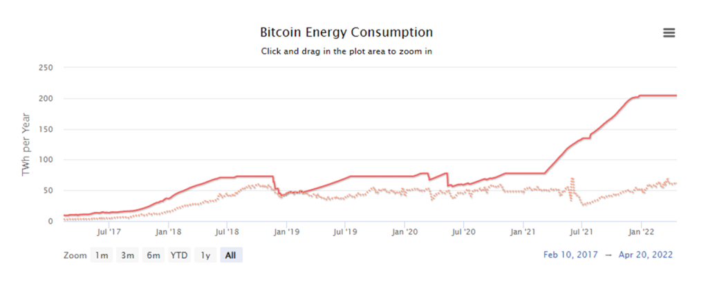 Graf: Vývoj Bitcoin Energy Consumption Indexu od roku 2017 do roku 2022